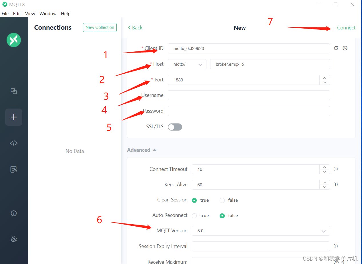第三步 MQTTX基本设置:用MQTT X 客户端软件与平台连接并上发数据,这一步非常关键,这一步能否走通直接决定终端硬件是否能将数据上报到平台,其实单片机编程难度不大,但是如果不能确保服务器是否可以上报数据那是非常糟糕的,所以我们采用MQTT X 客户端软件(免费下载)在电脑端运行并填写联网信息测试数据是否可以上报来提高最终硬件终端的开发效率。如图11为MQTTx 的界面,按照图11的步骤填写联网信息。如图11的1,2,3,4,5,6位置全部正确填写后点击位置7可以实现MQTTX与OneNET链接。