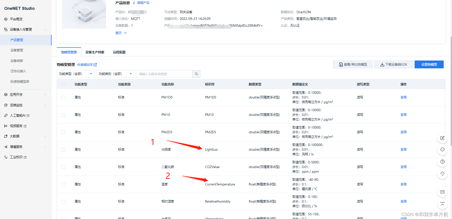如图19位属性标识符的获取,如图19的1位置和2位置查看光照值和温度的属性标识符并填写到自己的数据格式里。以上数据time字段后的时间戳一定要在生成密码的时间戳之前,在换算的时候选择ms为单位,我以上的时间是2022-09-23 15:40:30的时间。