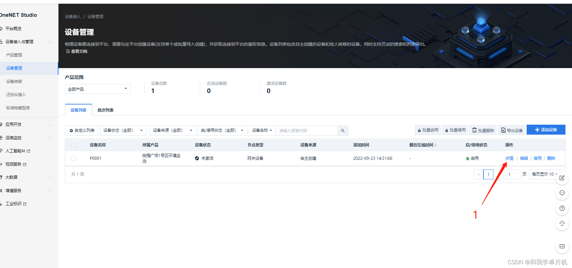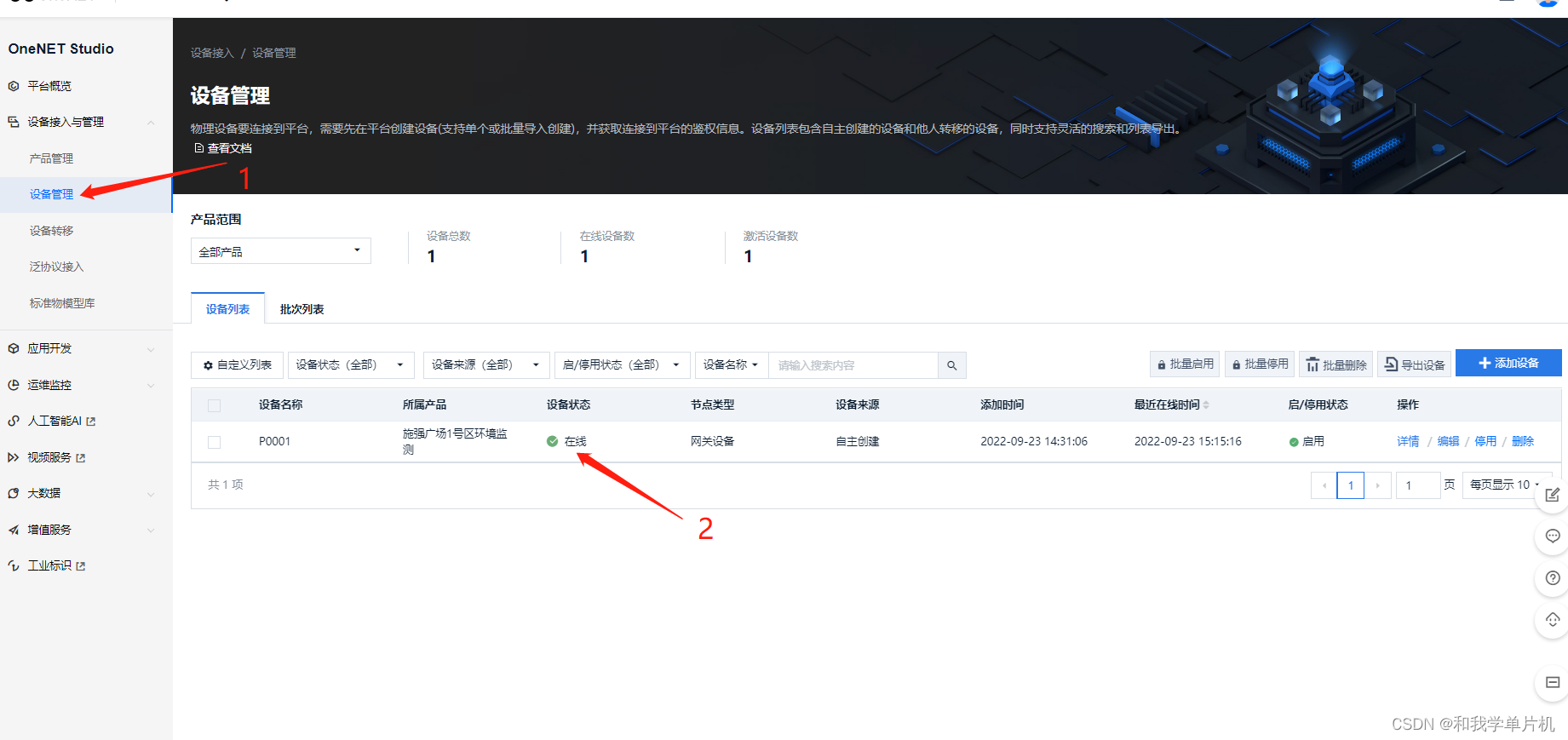 MQTTX与云平台服务器链接成功后,如图17,在平台上的设备管理页面可以看到图17位置2显示设备状态为“在线”,这里也非常关键一定要出现和图16一样的页面才算前面的准备工作是做成功的,如果有一点不一样那就要回到前面的步骤继续检查,细心发现问题。或者请教他人,如果需要请教作者本人则一定要告知你是在哪一步骤的哪个图片上出差错。