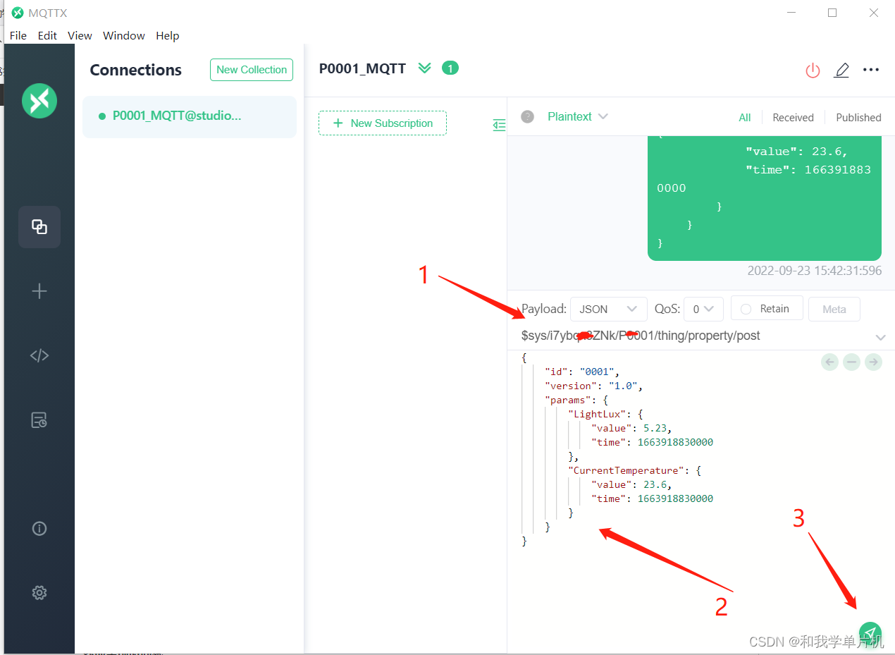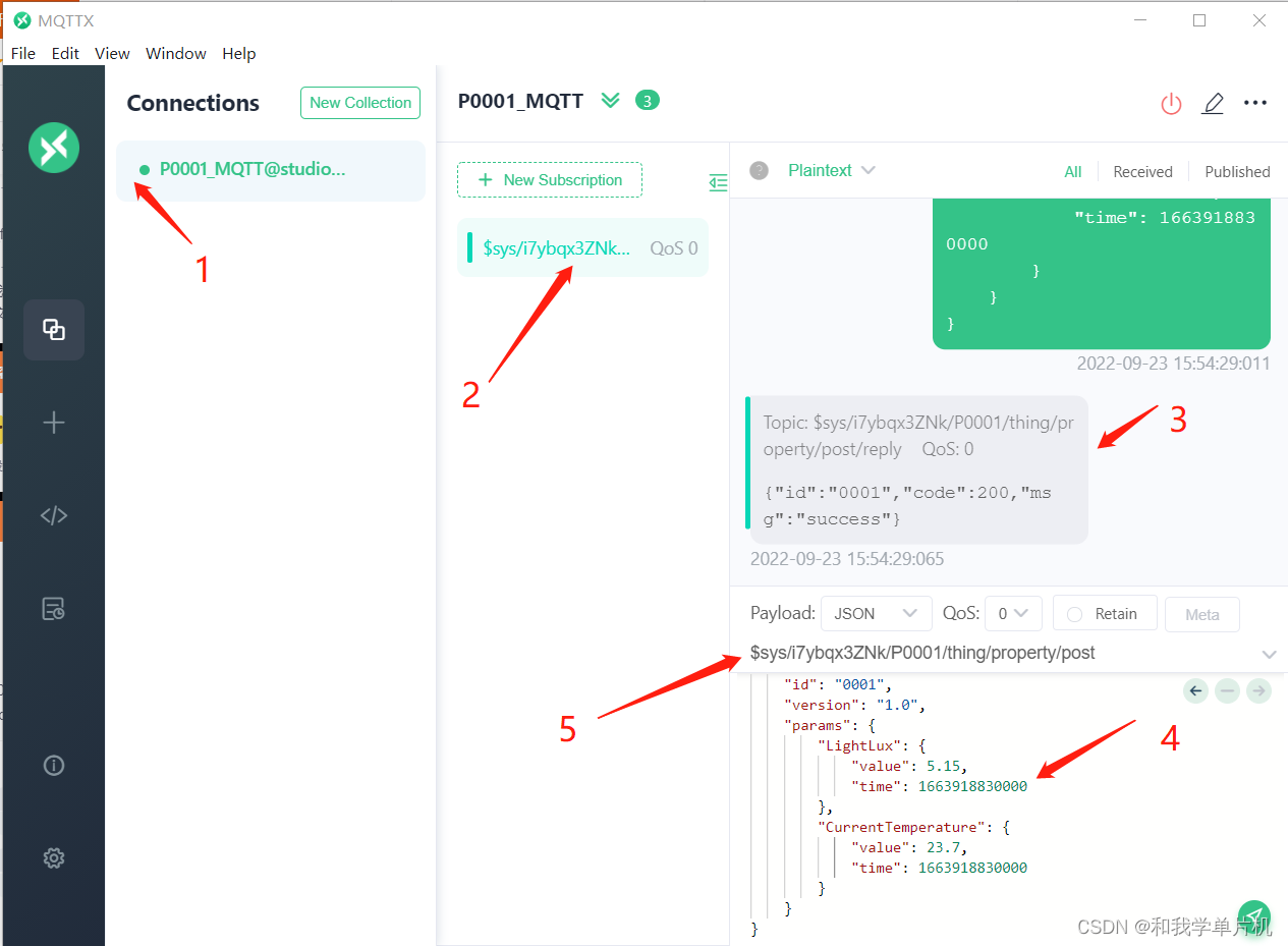 第九步 回顾总结:结合如图23的4个位置我们再进行回顾下,1位置为与服务链接成功的标志,2位置为服务器回复发送状态的topic的位置,3位置为服务器回复的数据,4位置为我们上发的数据,5位置为我们上发的topic。