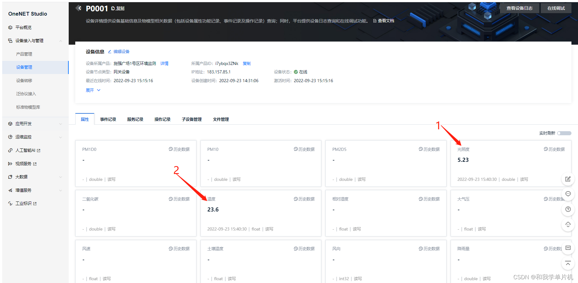 可以看到OneNET云平台Studio上有你上报的数据,在相应的属性里,如图21的1和2位置有我们上发的数据。