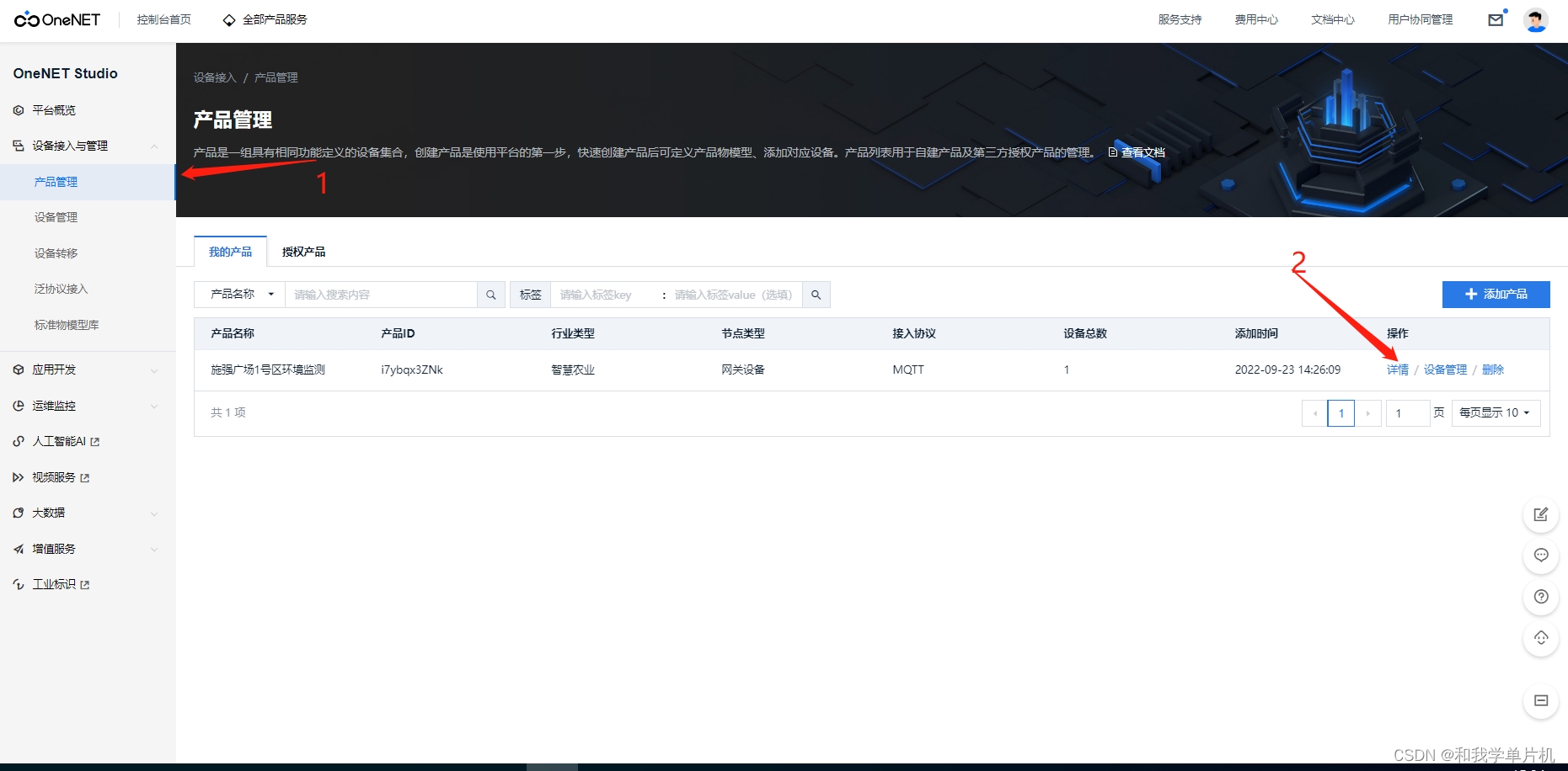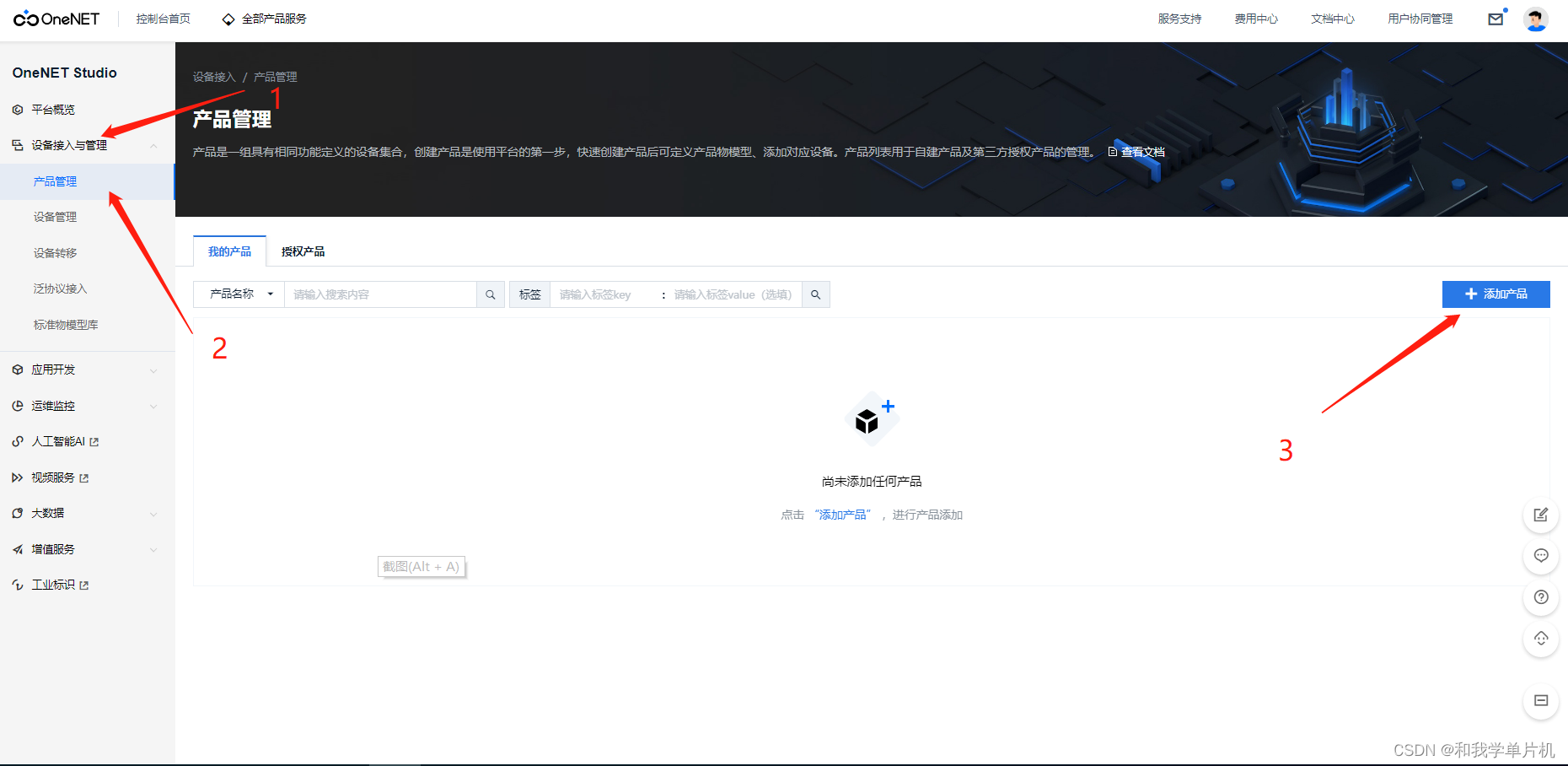 第一步 创建产品:先在OneNET Studio 建立一个产品,如图3的步骤1,2,3的位置顺序进入点击“创建产品”的页面,