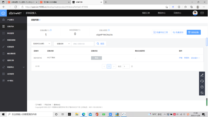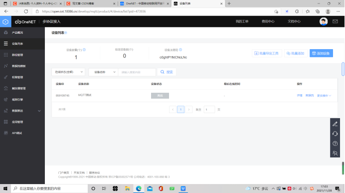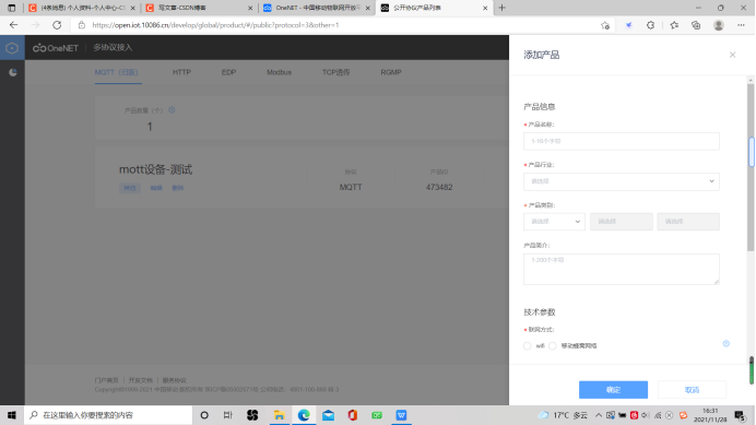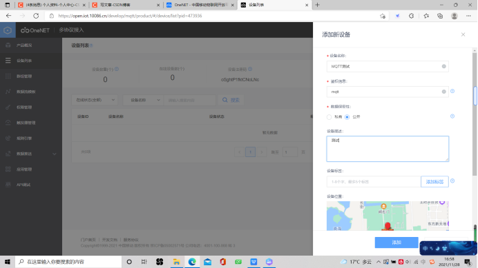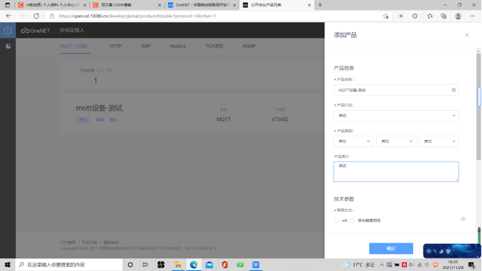 技术参数中联网方式我们可以根据实际情况来选择,设备接入协议选择MQTT协议,操作系统选择uC/OS系统,网络运营商选择移动。接着系统会弹出一个页面我们选择立即添加设备