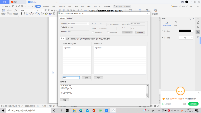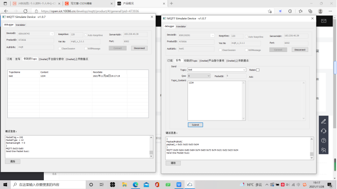 我们打开simulate-device软件把设备ID丶产品ID丶鉴权信息填上以后,keepAlice:120,再把Auto keepAlice勾选上,点击connect进行登录。