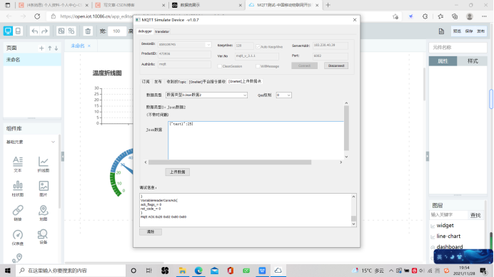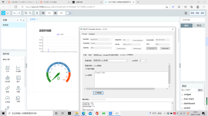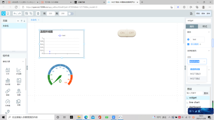仪表盘和折现图的操作基本一致也是选择数据流,设备选择设备一,数据流选择test1