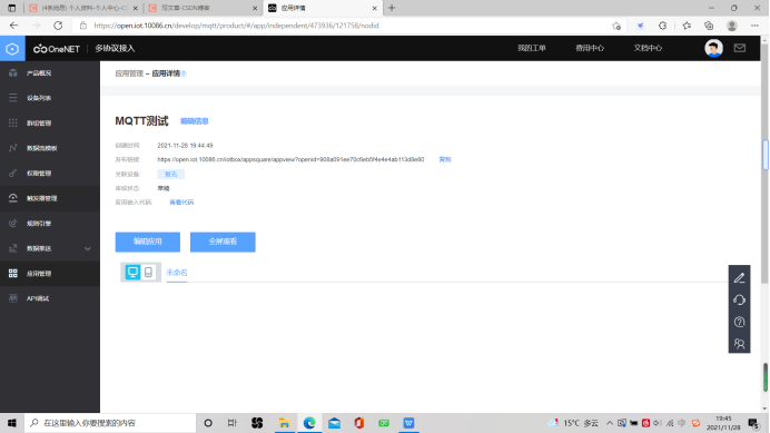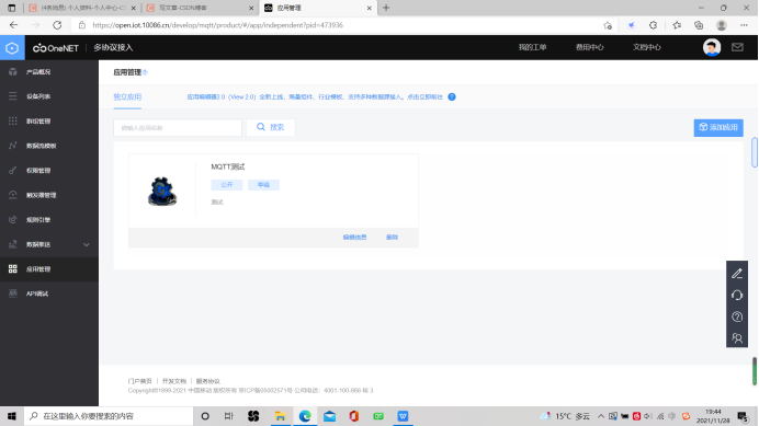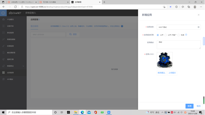应用名称我们先选择MQTT测试,应用阅览权限选择公开,应用描述可以自己进行填写,并且需要一个应用LOGO,LOGO的选择是没有要求的
