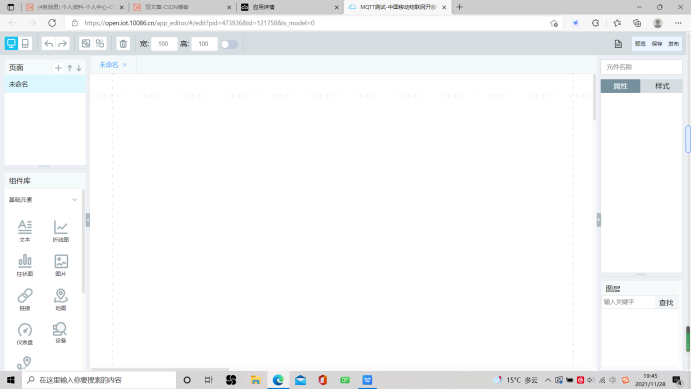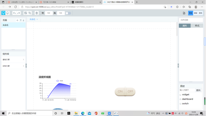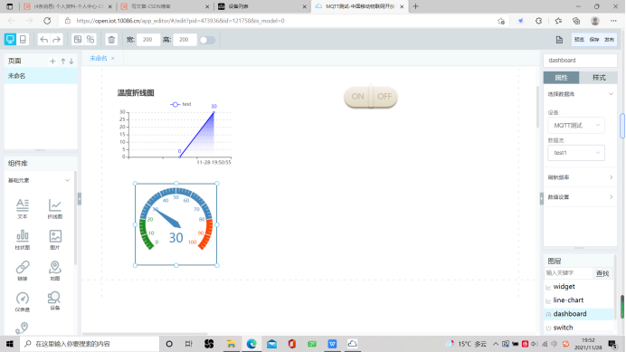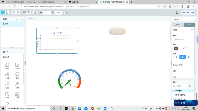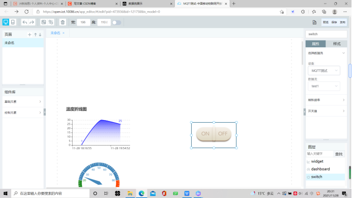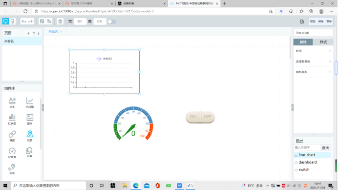 在编辑页面的左侧有个组件库里面的东西都可以供我们使用,我们今天就先学习一个折线图,一个仪表盘和一个开关
