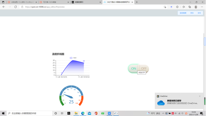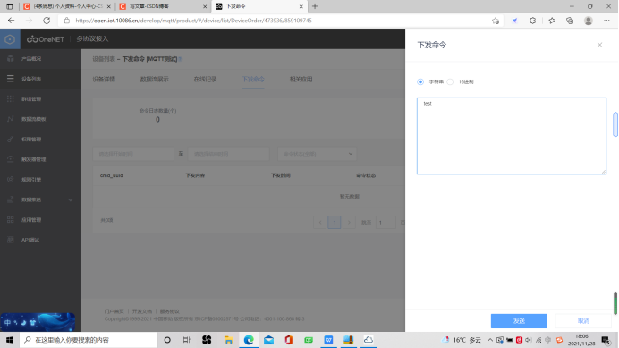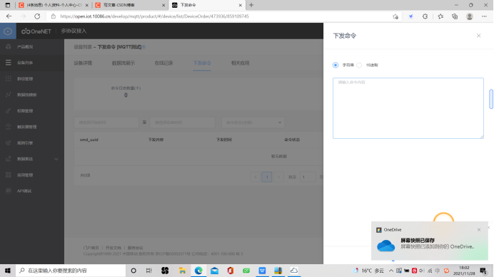 我们在预览页面进行的操作在topic-comtent软件上是可以显示的,在{onenet}平台指令接受中可以看到,平台下发了指令“1”,这个“1”所代表的就是开