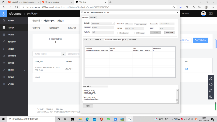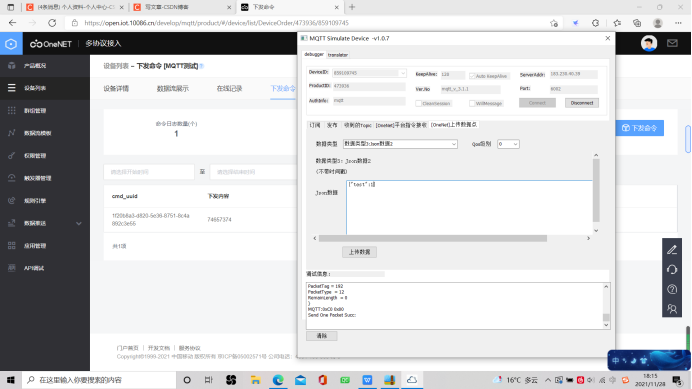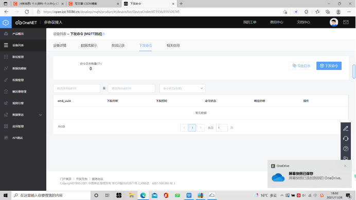 设备登录以后我们就可以进行MQTT命令下发丶ONENET上传数据点丶订阅和发布