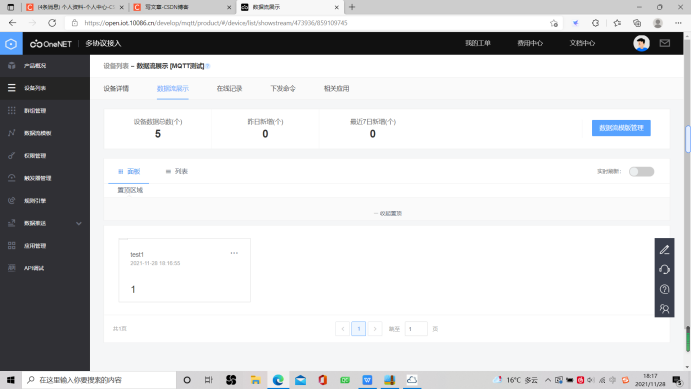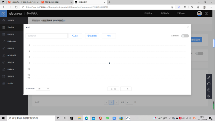 我们返回ONENTE平台在设备列表中点击数据流,在面板和列表中都可以看到我们本次上传的数据