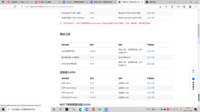 模拟数据上传还需要用到simulate-device软件,这个软件可以在ONENET服务支持中的下载专区进行下载。