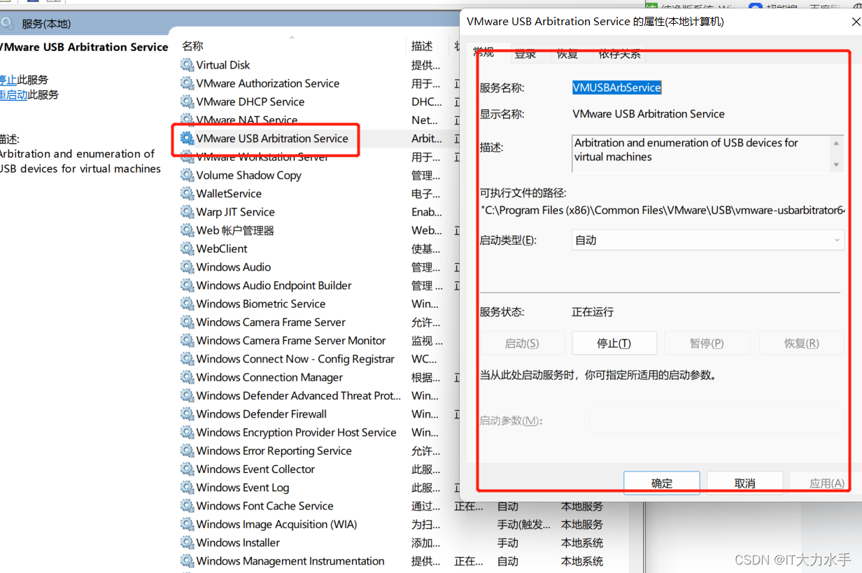 在服务页面找到“VMUSBArbService”服务,并将其启动。