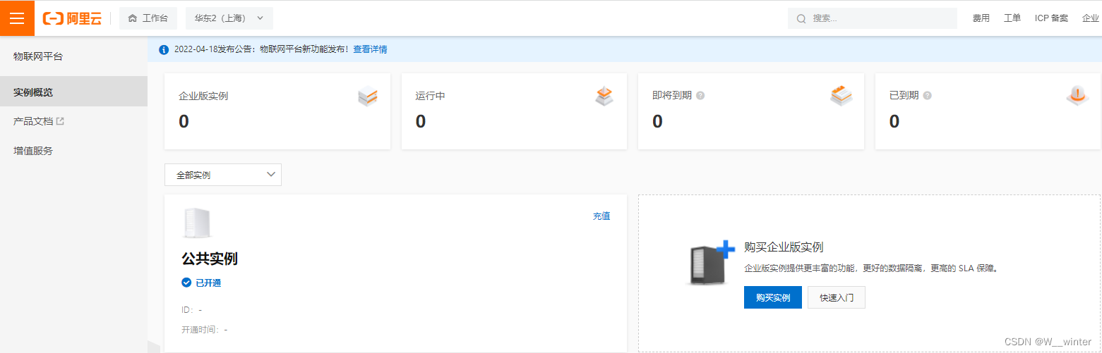 1、进入阿里云物联网平台选择公共实例