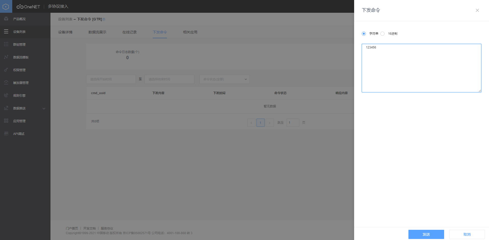 (3.)点击右上方的蓝色按键下发命令,便会弹出下方页面,在这里我们就用字符串的方式做演示,首先先在字符串与16进制之间选择字符串,然后输入字符串便可