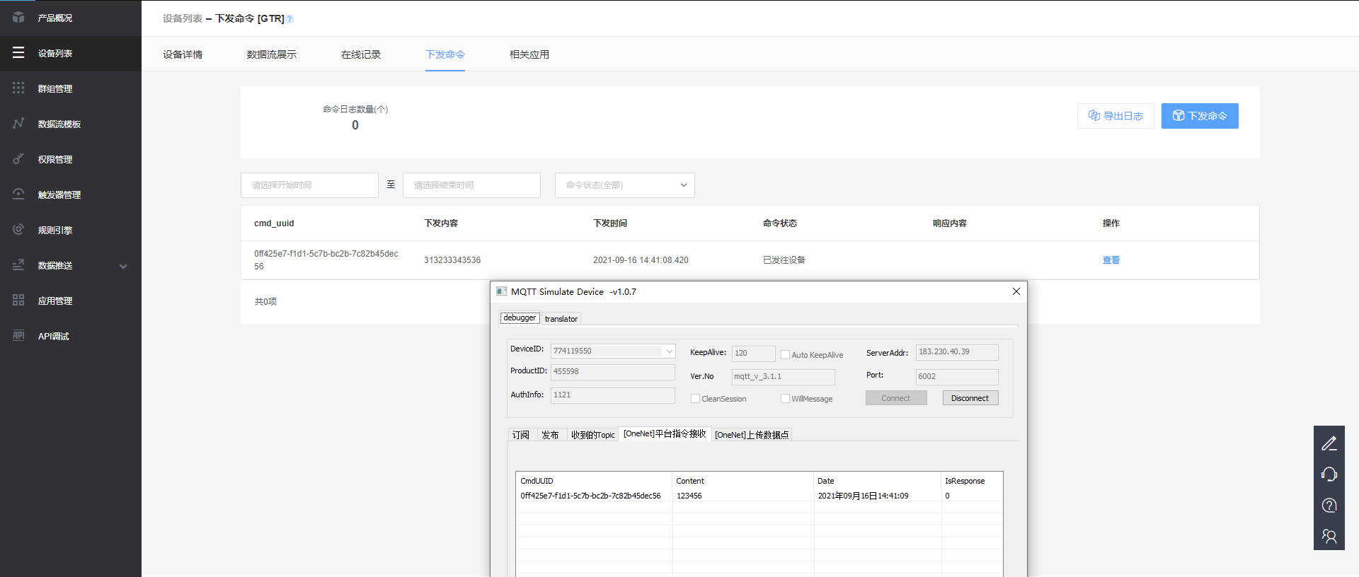(4.)确认无误后,点击发送,然后平台就会提示你发送成功,同时也会在平台下方列表中和测试工具的[OneNET平台指令接收]中显示出来刚才所下发的命令