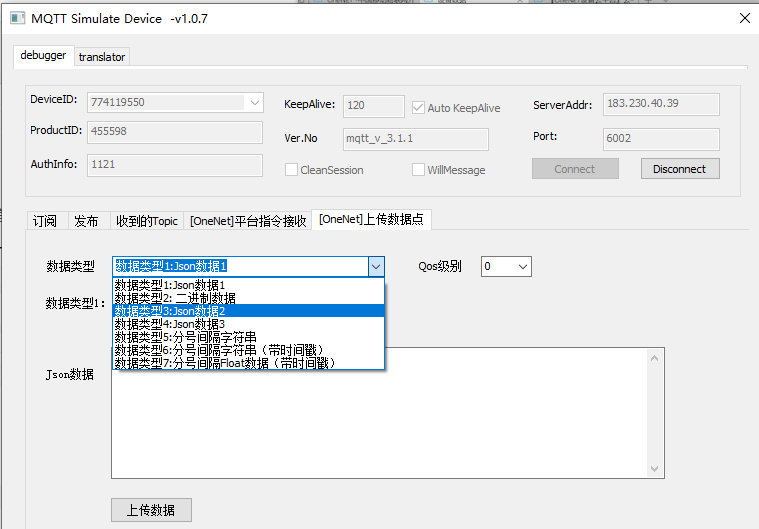 (2.)在测试工具运行的也就是设备在线的条件下,我们在测试工具中打开[OneNet上传数据点],然后并在数据类型中选择数据类型3:Json数据2