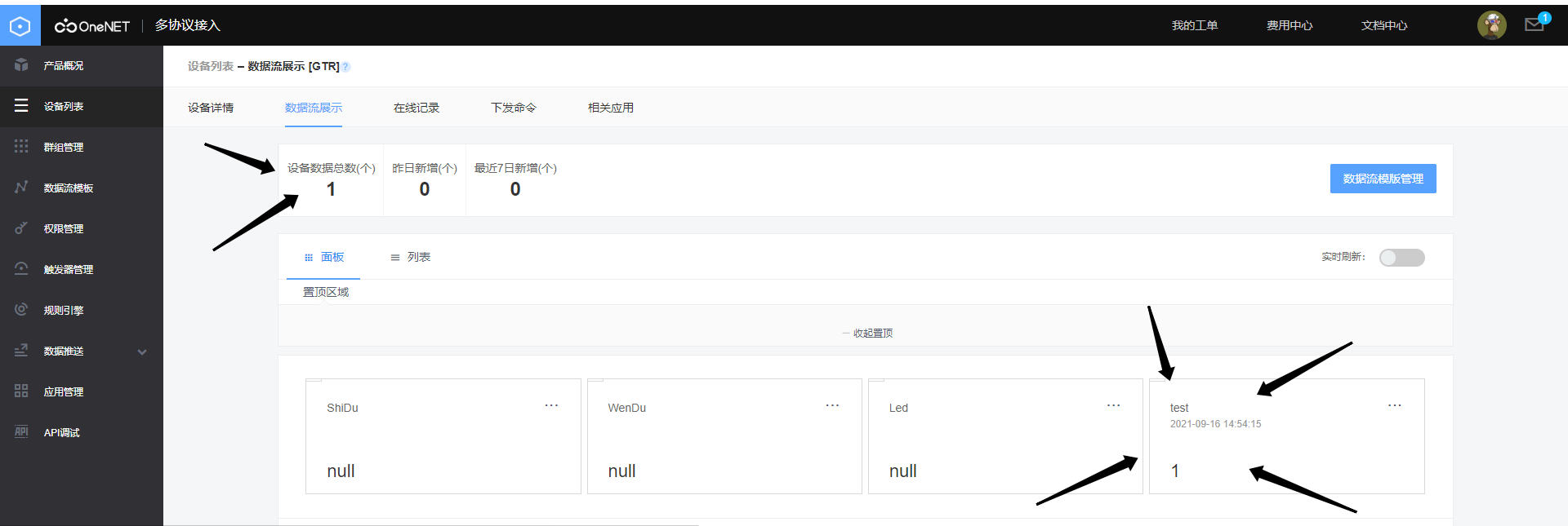 (4.)确认无误后点击上传数据按键,然后刷新一下OneNET平台的数据流展示的页面便会在数据流中看到有数据了