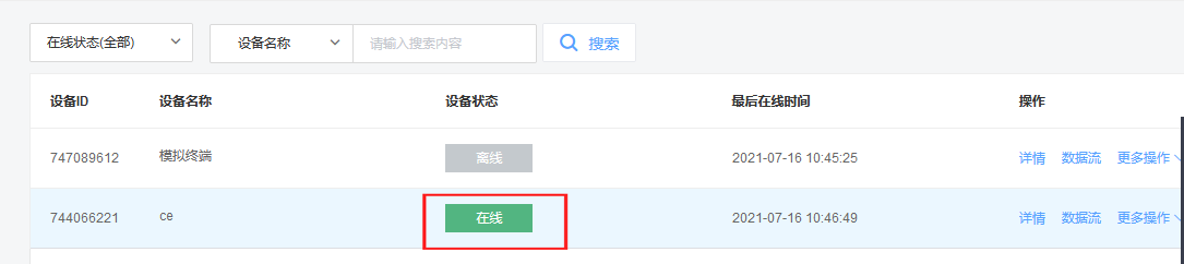 至此DTU和ONEnet的连接已完成,等待ONEnet上你的设备显示在线即可。
