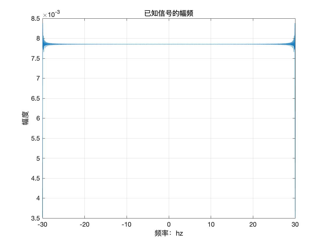 在这部分输出图像中可以看出,sinc函数的幅频响应为近似的矩形窗口,与sinc和矩形窗的傅里叶变换相符合,又因为matlab只能进行有限维的运算,相当于sinc函数是离散且有边界的,所以矩形窗口的形状并不是纯粹的直线,数据越丰富,输出结果就与理论值越相近。