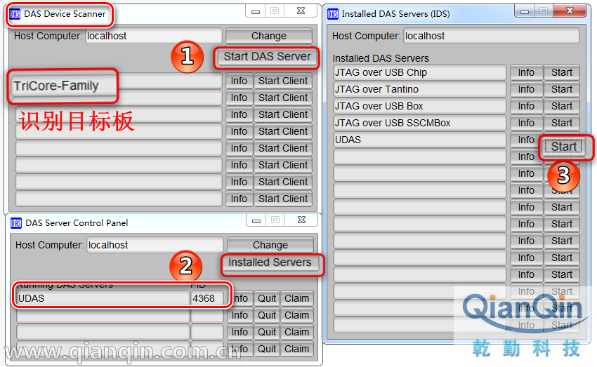 安装完成后,连接好仿真器,目标板,电源,先打开DAS Device Scanner 窗