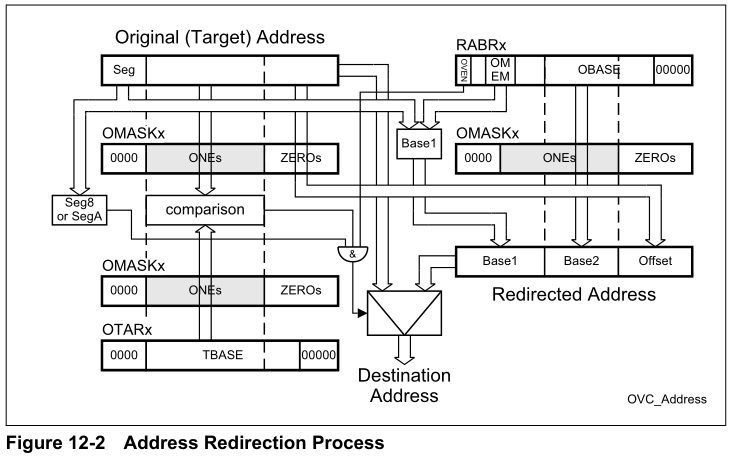 对段8H或段AH的任何数据访问都要对照所有激活的overlay blocks进行检查。对于每个激活的overlay blocks,地址位27…5与目标base地址(OTARx)进行比较,这种位比较由OMASKx寄存器的内容限定。如果相应的OMASKx位设置为1,则地址位参与比较。如果当前访问的地址中OMASKx为1的位的值等于OTARx寄存器中的相应位,则访问被重定向