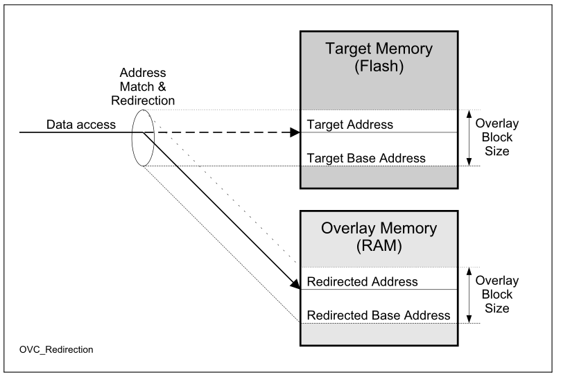 将数据访问从原始目标内存(“目标地址”)重定向到覆盖内存(“重定向地址”)的原理如下所示。这里的原始内存一般指的就是flash地址,重定向地址为ram地址