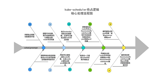 下方处理流程图展示了kube-scheduler抢占调度驱逐的核心处理步骤,在开始抢占逻辑处理之前,会先进行抢占调度功能是否开启的判断。