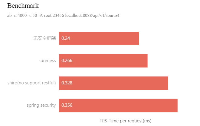 基准测试显示 Sureness 对比无权限框架应用损耗 0.026ms 性能,Shiro 损耗0.088ms、Spring Security 损耗 0.116ms。
