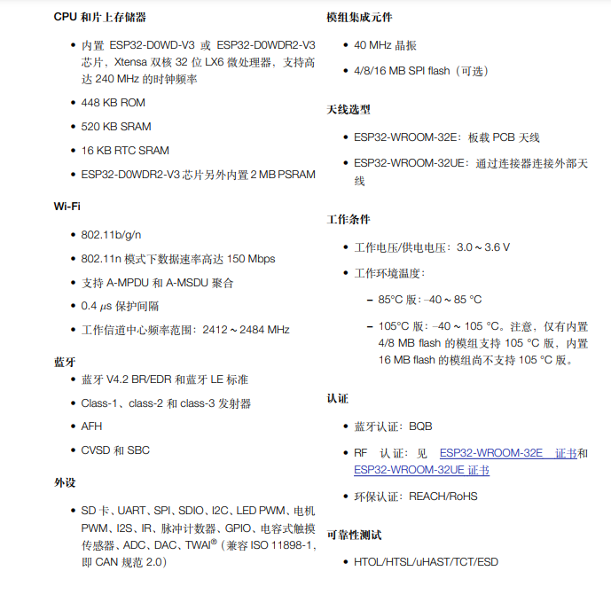 以ESP32-WROOM-32E3为例,具体参数可以参考技术文档,下列展示出一些主要参数。