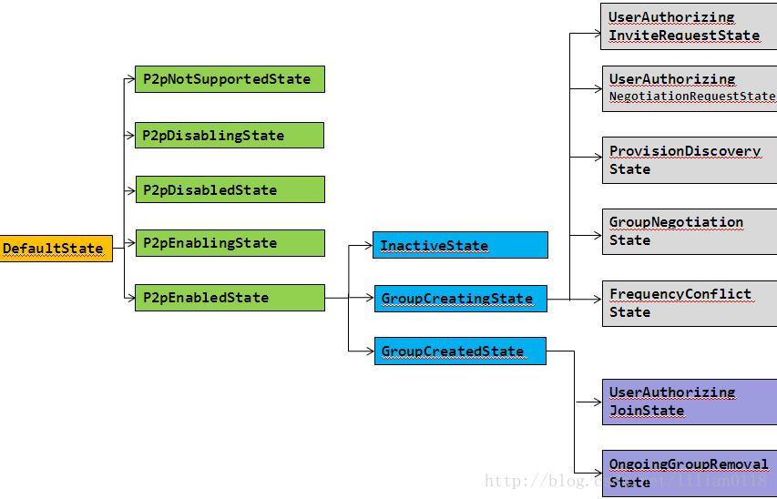 通过上面的构造函数,我们可以看出P2pStateMachine的各个State关系如下。并且若在支持P2P的情况下,InitialState是P2pDisabledState;若在不支持P2P的情况下,InitialState是P2pNotSupportedState。