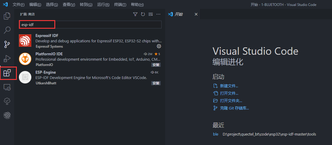 1)在VSCODE扩展插件中搜索:esp-idf,点击安装