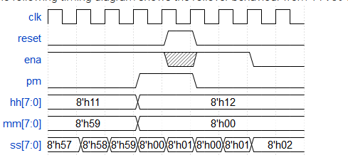 The following timing diagram shows the rollover behaviour from 11:59:59 AM to 12:00:00 PM and the synchronous reset and enable behaviour.