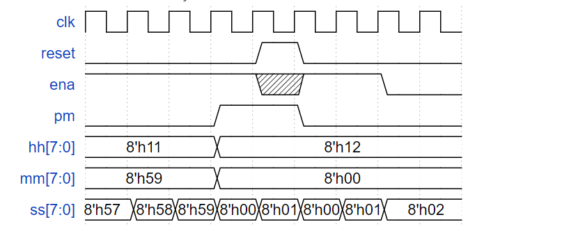 reset resets the clock to 12:00 AM. pm is 0 for AM and 1 for PM. hh, mm, and ss are two BCD (Binary-Coded Decimal) digits each for hours (01-12), minutes (00-59), and seconds (00-59). Reset has higher priority than enable, and can occur even when not enabled.