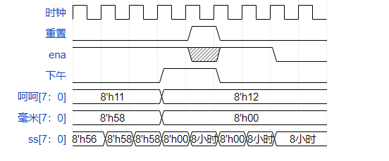 一个时钟秒加一,11:59:59时,下一个状态pm进行翻转,同时要设置计数器的进位