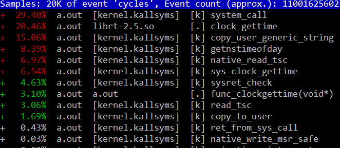 这里说“开销集中在系统调用本身”意思是说clock_gettime本身的执行就非常耗费时间,其大概的调用路径是