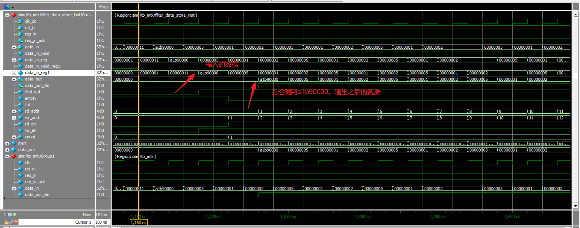 在data_in的数据中找到特殊字符32’hA1b9_0000,特殊字符前的数据全部丢掉,特殊字符后的数据全部收下来,并且保存在sync_fifo中,当sync_fifo为非空的时候,将数据读出放到data_out上,并用data_out_vld指示数据的有效性。