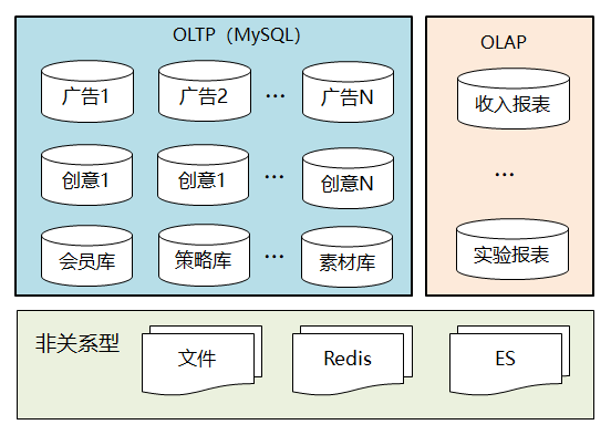 OLTP场景,包括广告库、创意库、会员库、广告产品库、广告策略库等,这些都存储在MySQL中,数据规模较大的广告库和创意库,按照广告主ID Hash做分库分表。