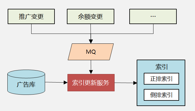 各个业务系统在推广、余额等信息变更时,发MQ消息,索引更新服务订阅MQ来感知变化,完成增量同步。