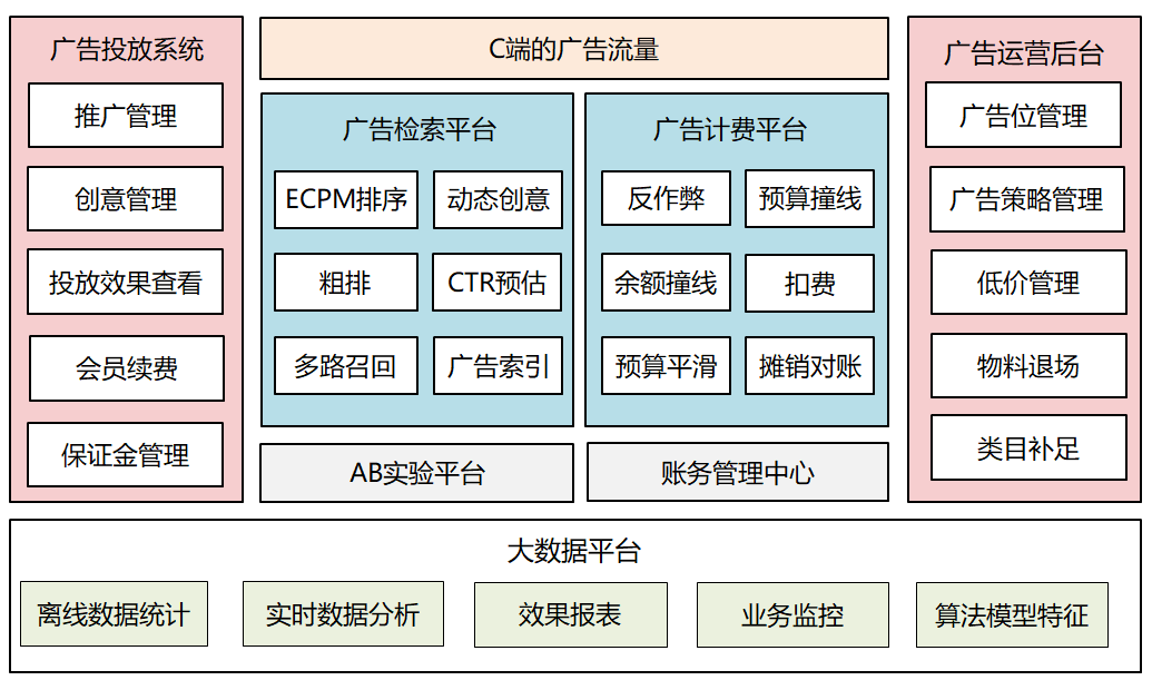 广告检索平台:承接C端的高并发请求,负责从海量广告库中筛选出几个或者几十个广告,实时性要求高,这个平台通常由多个微服务组成。