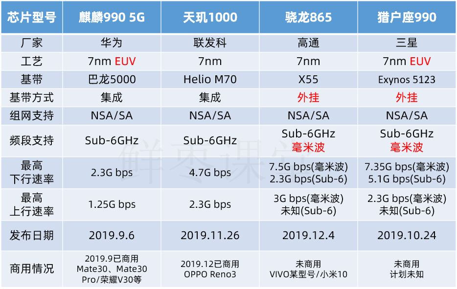 华为之所以集成了5G基带,并不代表他完全强于高通。有一部分原因,是因为华为麒麟990采用的是2018年ARM的A76架构(其它几家是2019年5月ARM发布的A77架构)。A77集成5G基带难度更大。