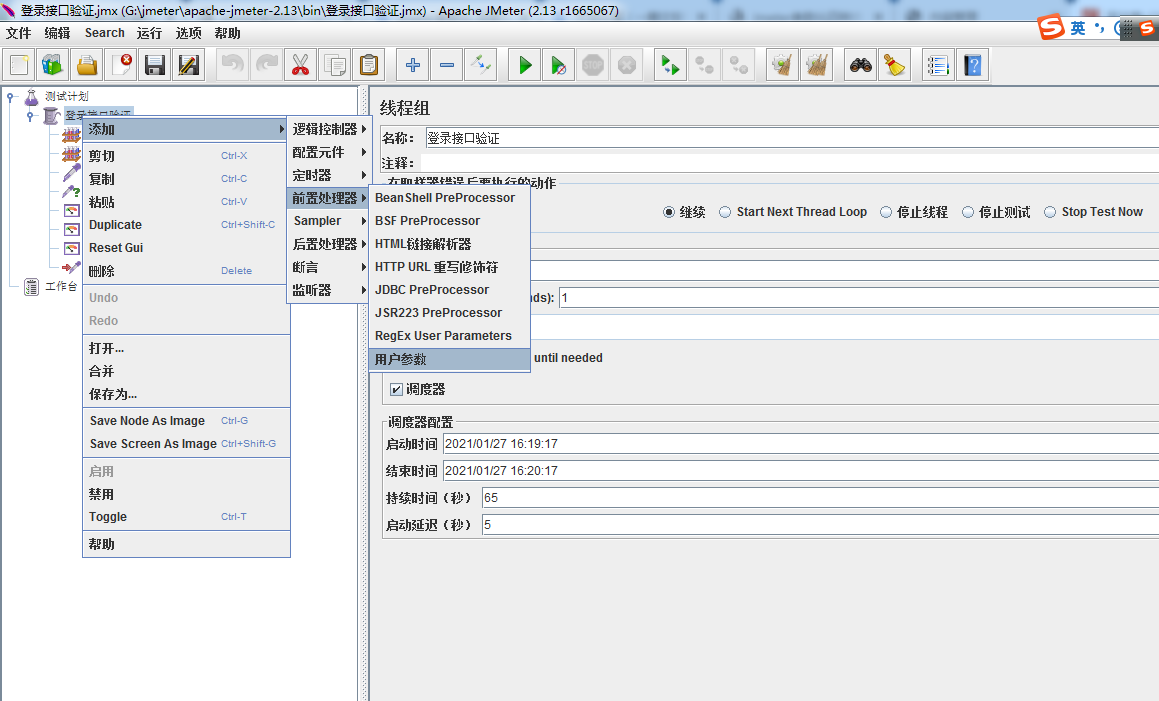 1、右击线程组【登录接口验证】-->【添加】-->【前置处理器】-->【用户参数】