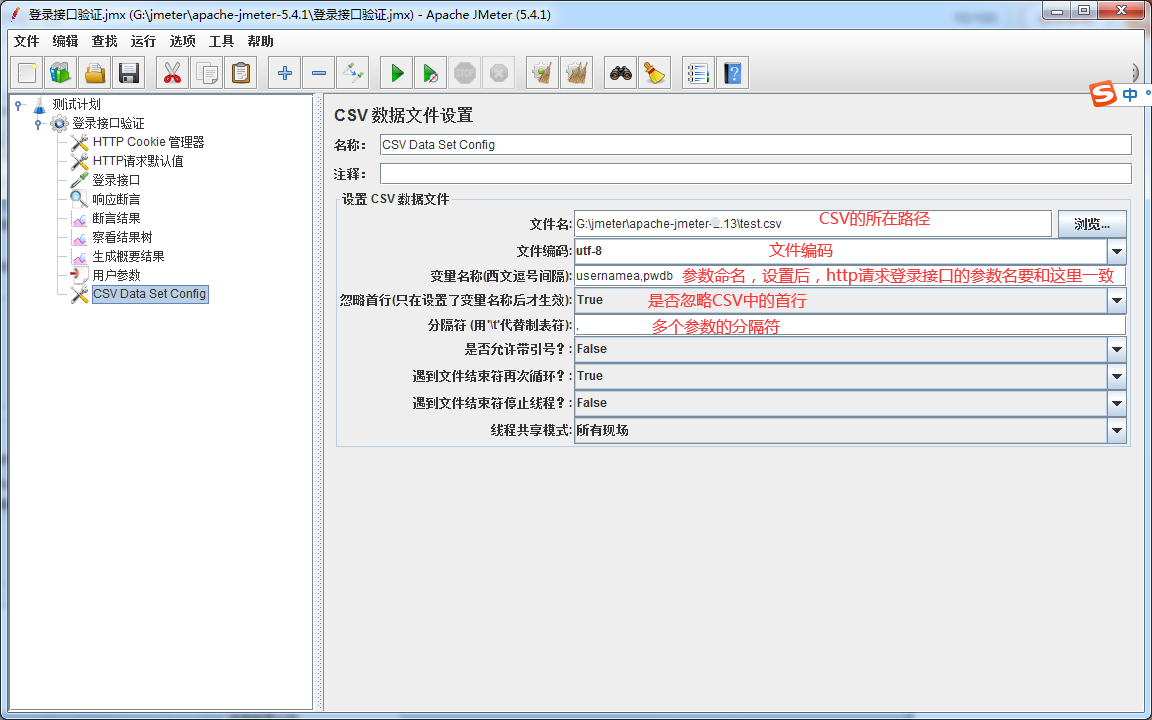 1、右击线程组【登录接口验证】-->【添加】-->【配置元件】-->【CSV Data set confing】