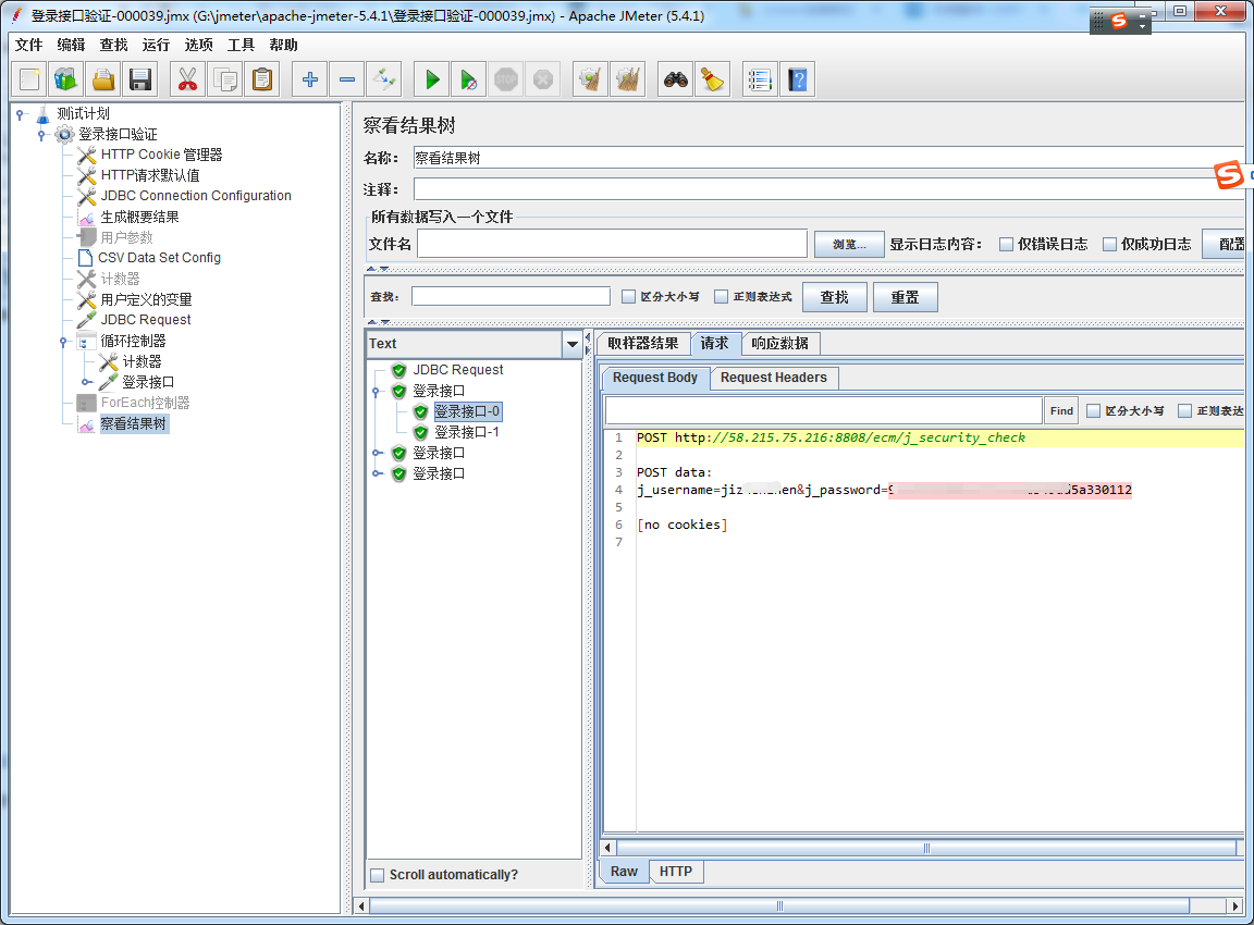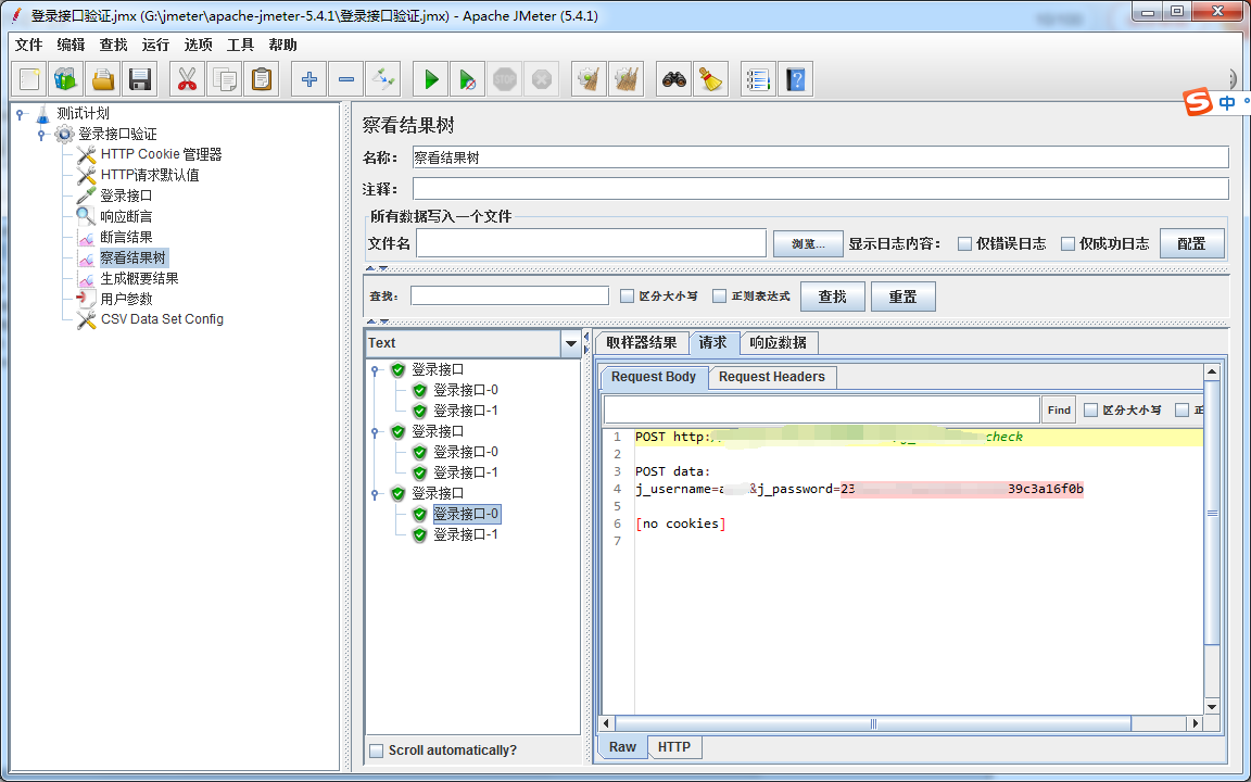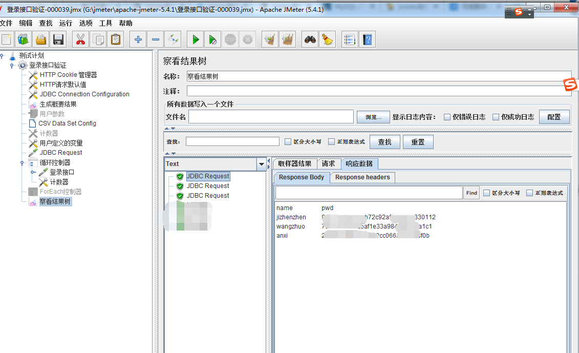 4、这里CSV有标题且设置了3组参数,所以设置了3个线程组,运行看结果,主要是看看是否正确启用参数: