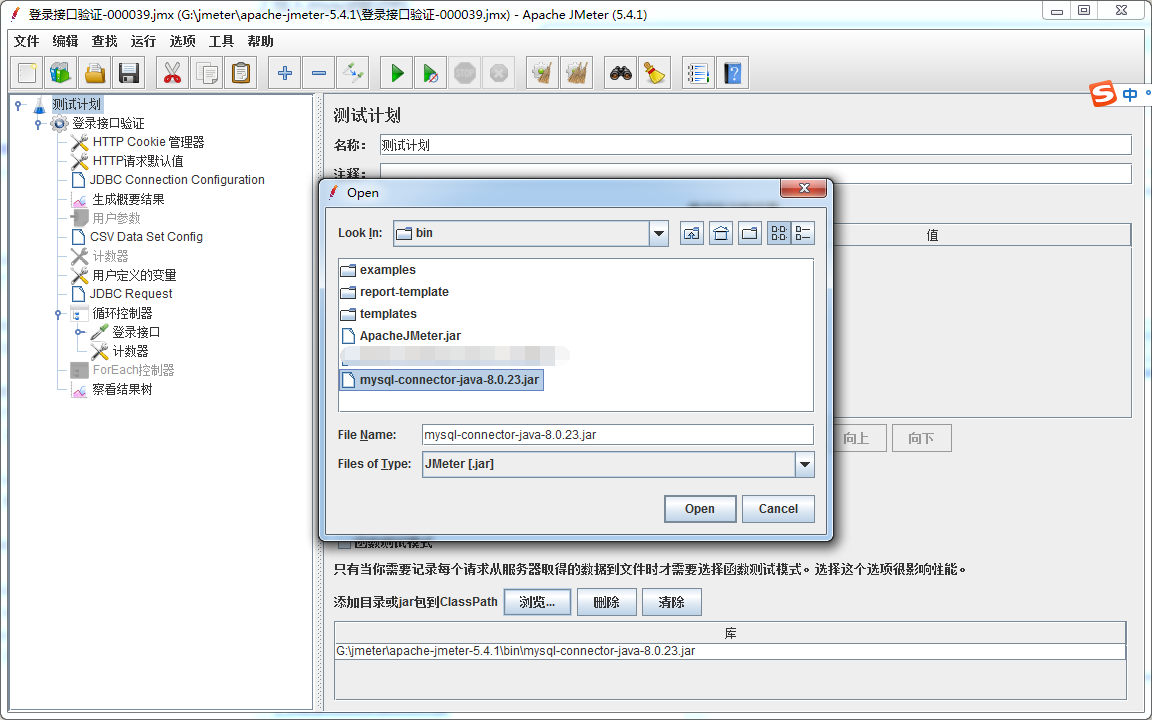 【测试计划】-->【右侧界面下方点击浏览】-->选择刚刚的jar包