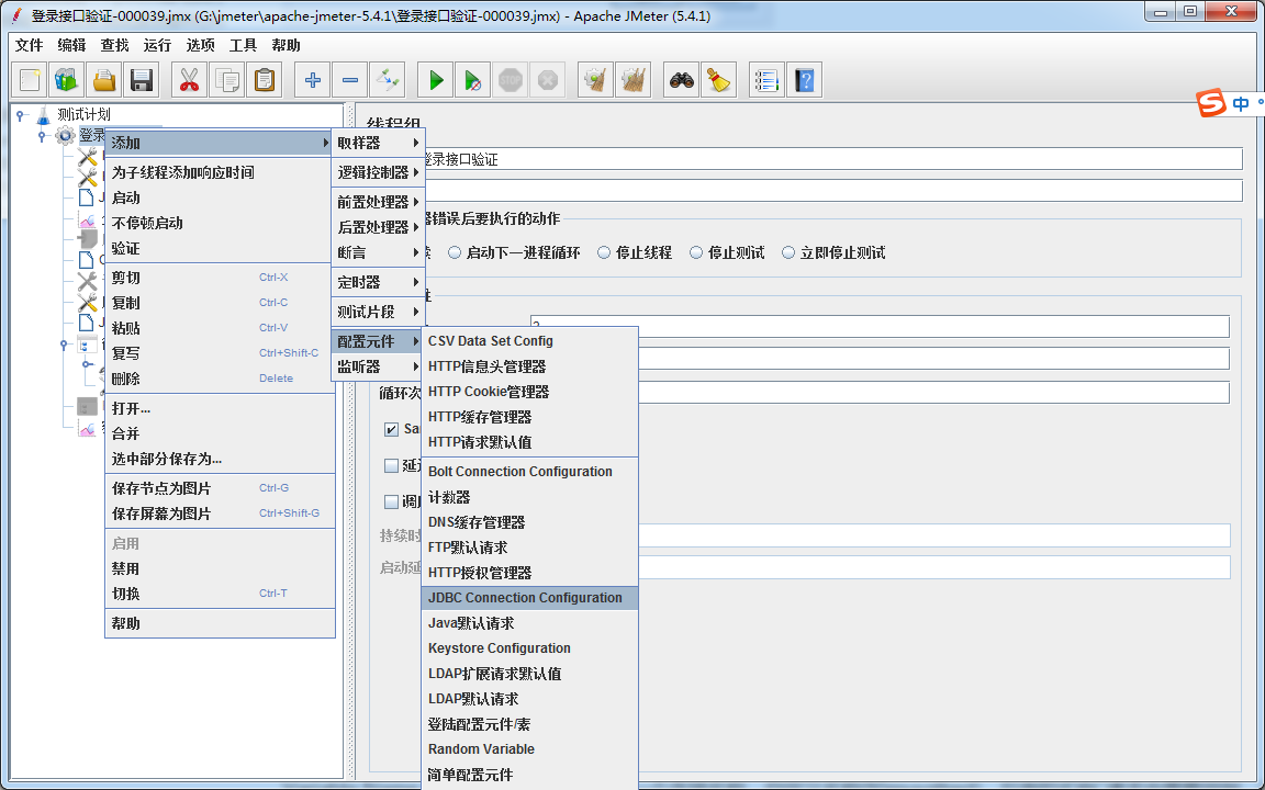 线程组【登录接口验证】(自定义名称)-->【右击】—>【添加】-->【配置元件】-->【JDBC Connection Configuration】