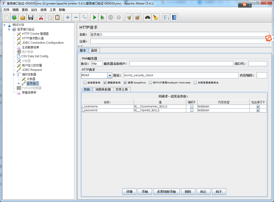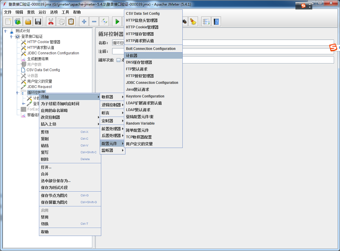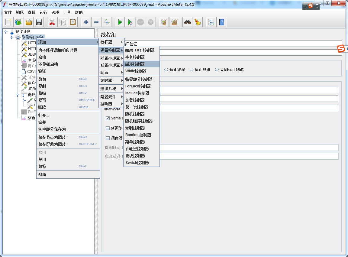 10、线程组【登录接口验证】(自定义的名称)-->【右击】—>【添加】-->【逻辑控制器】-->【循环控制器】