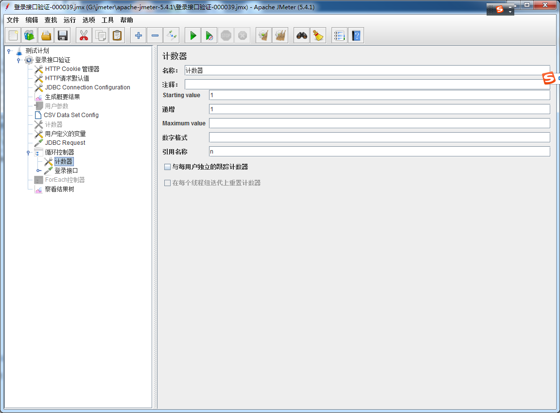 【循环控制器】-->【右击】—>【添加】-->【配置元件】-->【计数器】