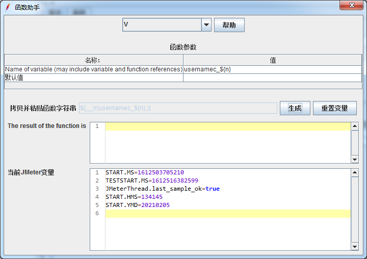 选择v,函数参数中输入usernamec_${n},点击生成(usernamec为jdbc request中 variable names那么值,n为计数器中引用名名称)