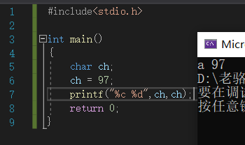 测试结果显示:字符型的变量,如果进行数字赋值,那么这个变量它既存储了ASCII码表中该十进制数字所对应的字符,同时也存储了该十进制数字,两者是可以在一个变量中输出的。