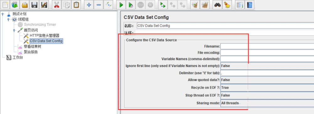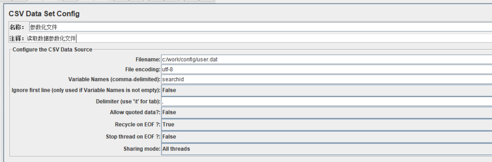 h,Recycle on EOF和Stop thread on EOF按需设置。是否循环,到结尾是否停止测试。我这里设置了True和False